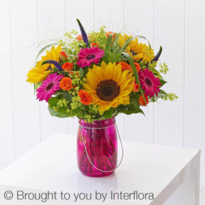 An ideal Summer bouquet gift in our current range is the Bold Brights Perfect Gift. This arrangement features sunflowers, cerise germini, blue veronica, orange spray roses and alchemilla mollis with salal and panicum grass, beautifully arranged in a lantern vase.