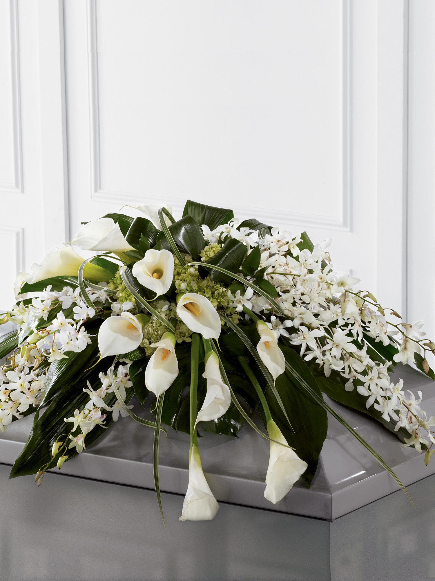White Dendrobium orchids, white calla lilies, green hydrangea and a variety of lush green leaves are expertly arranged to create a very graceful casket spray.