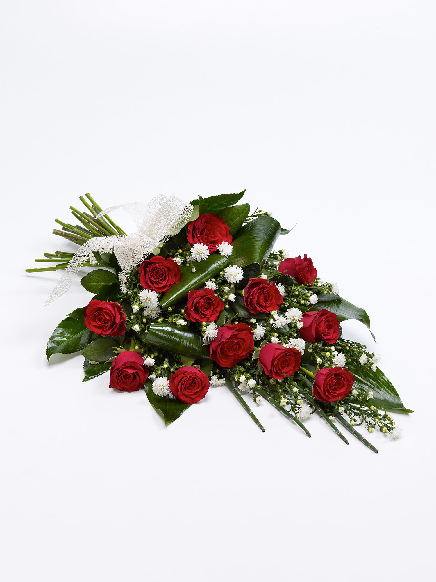 Elegant folded aspidistra and aralia leaves are nestled amongst large-headed red roses to create this stunning sheaf which is finished with delicate white September flower and foliage.