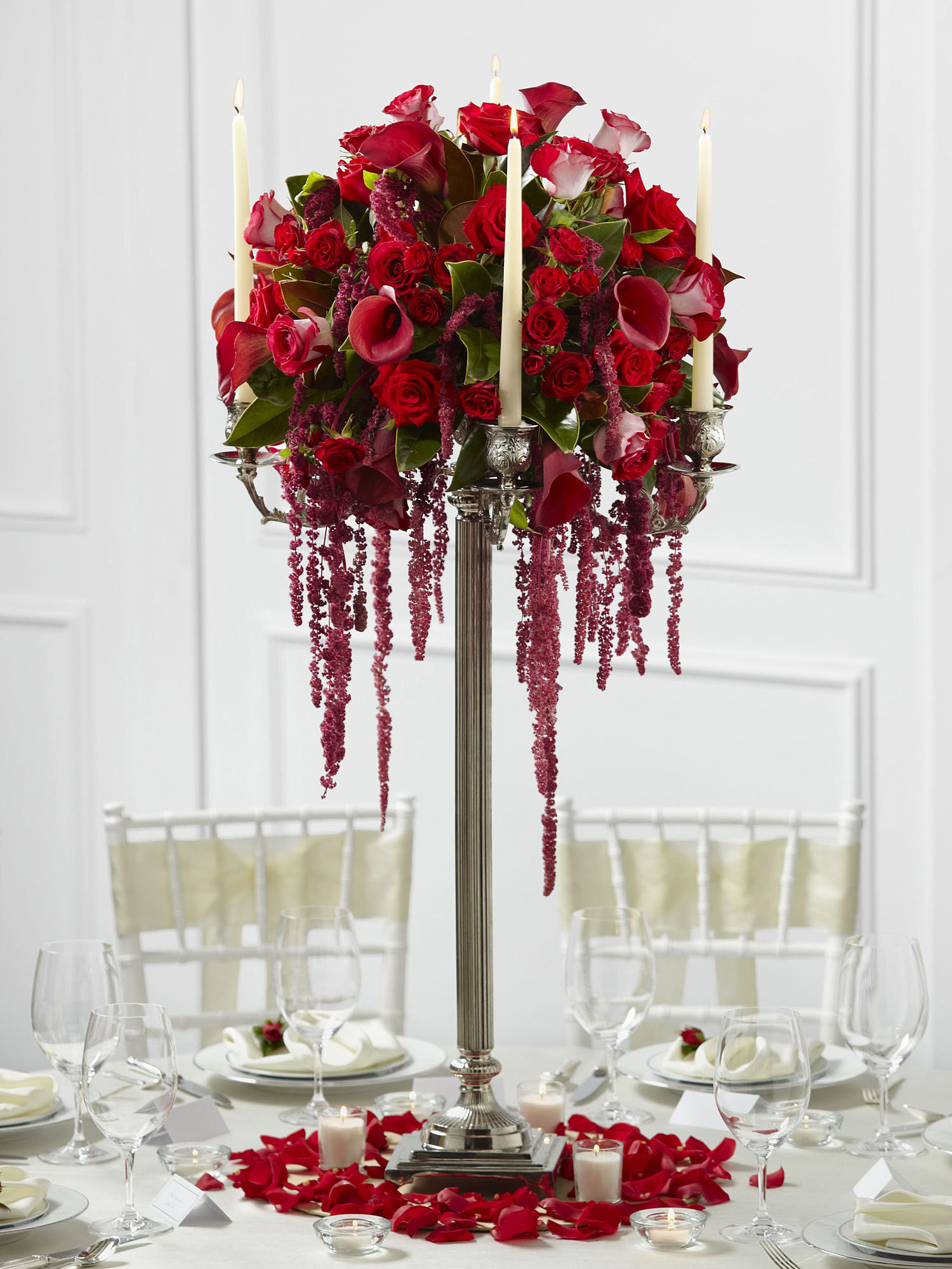 The Regency Centerpiece is a fantastic display of blooming elegance to give your wedding guests an impression that will last a lifetime. Red roses, spray roses, mini calla lilies, hanging amaranthus and bi-colored red and white roses are arranged to perfection and situated within a silver candelabra holding four white taper candles. At the base of this arrangement are additional votive candles and scattered rose petals to create a high impact, sophisticated look.