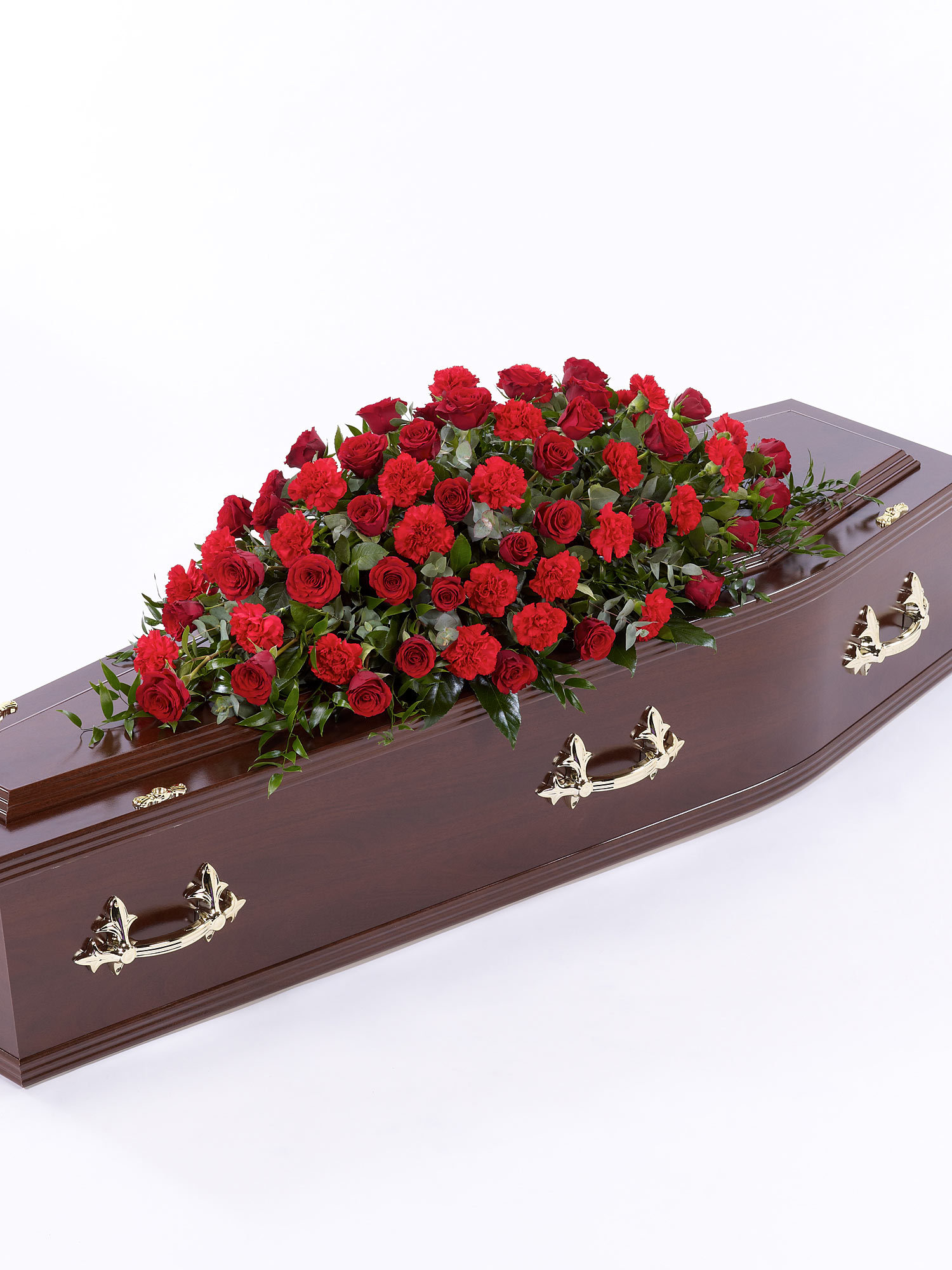 Large-headed roses combine with carnations and luxurious foliages to create this traditional casket spray.