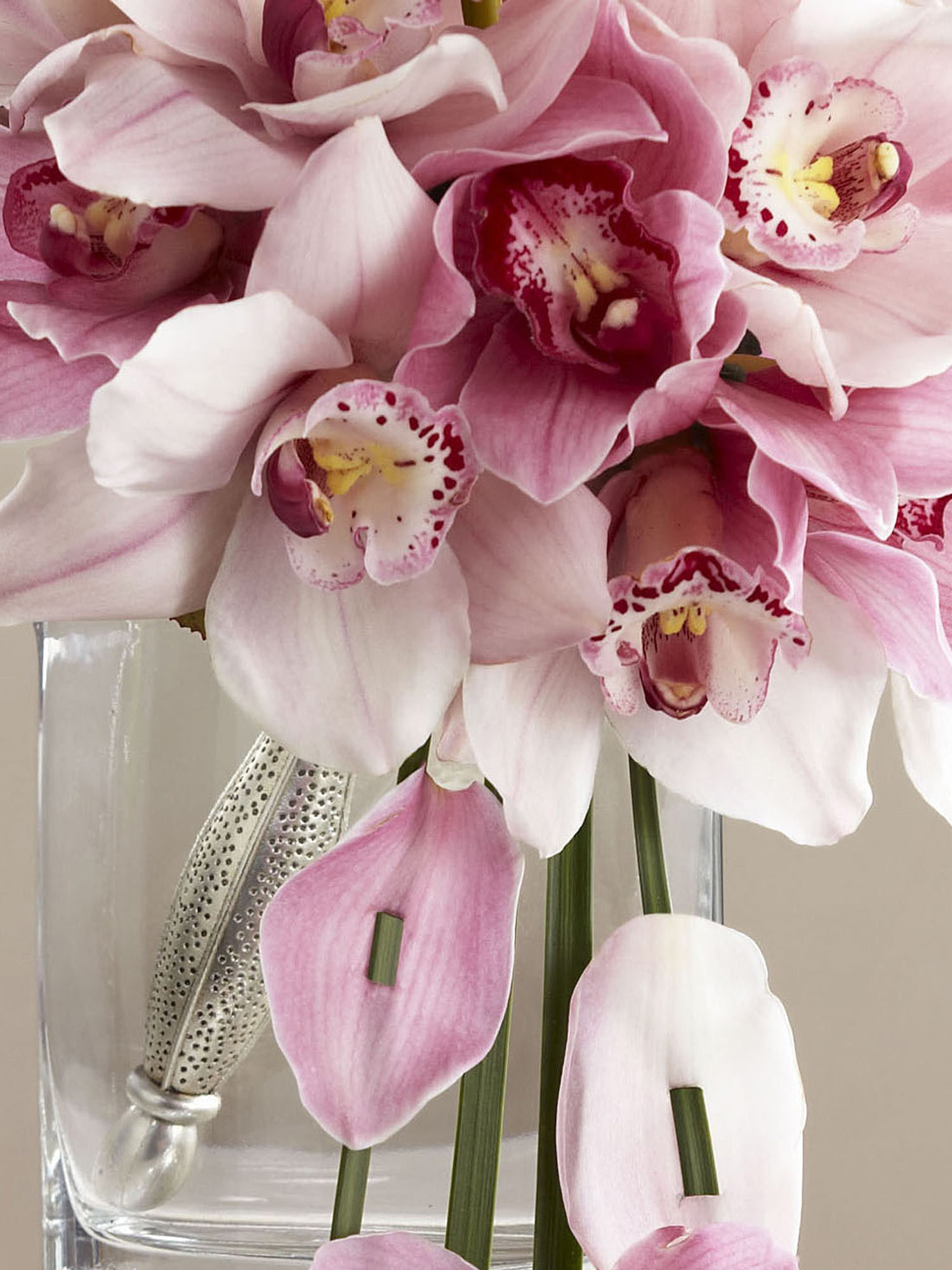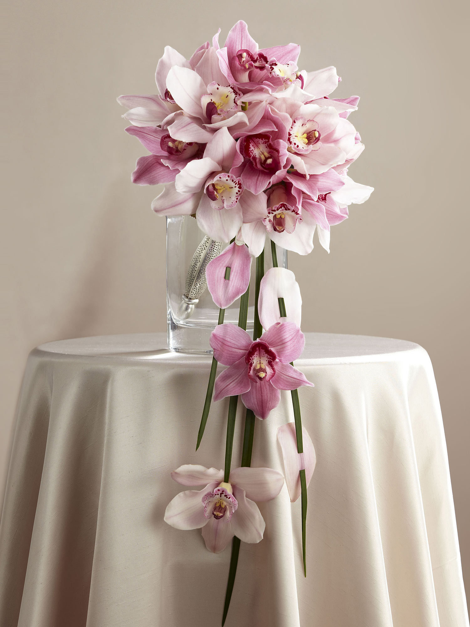 Lavender and pink cymbidium orchids are carefully arranged to form an impressive display accented with lily grass blades and galax leaves holding additional orchid blooms beautifully suspended from the bouquet. Presented in a silver metallic bouquet holder, this arrangement will hold their attention as you take your steps down the aisle.