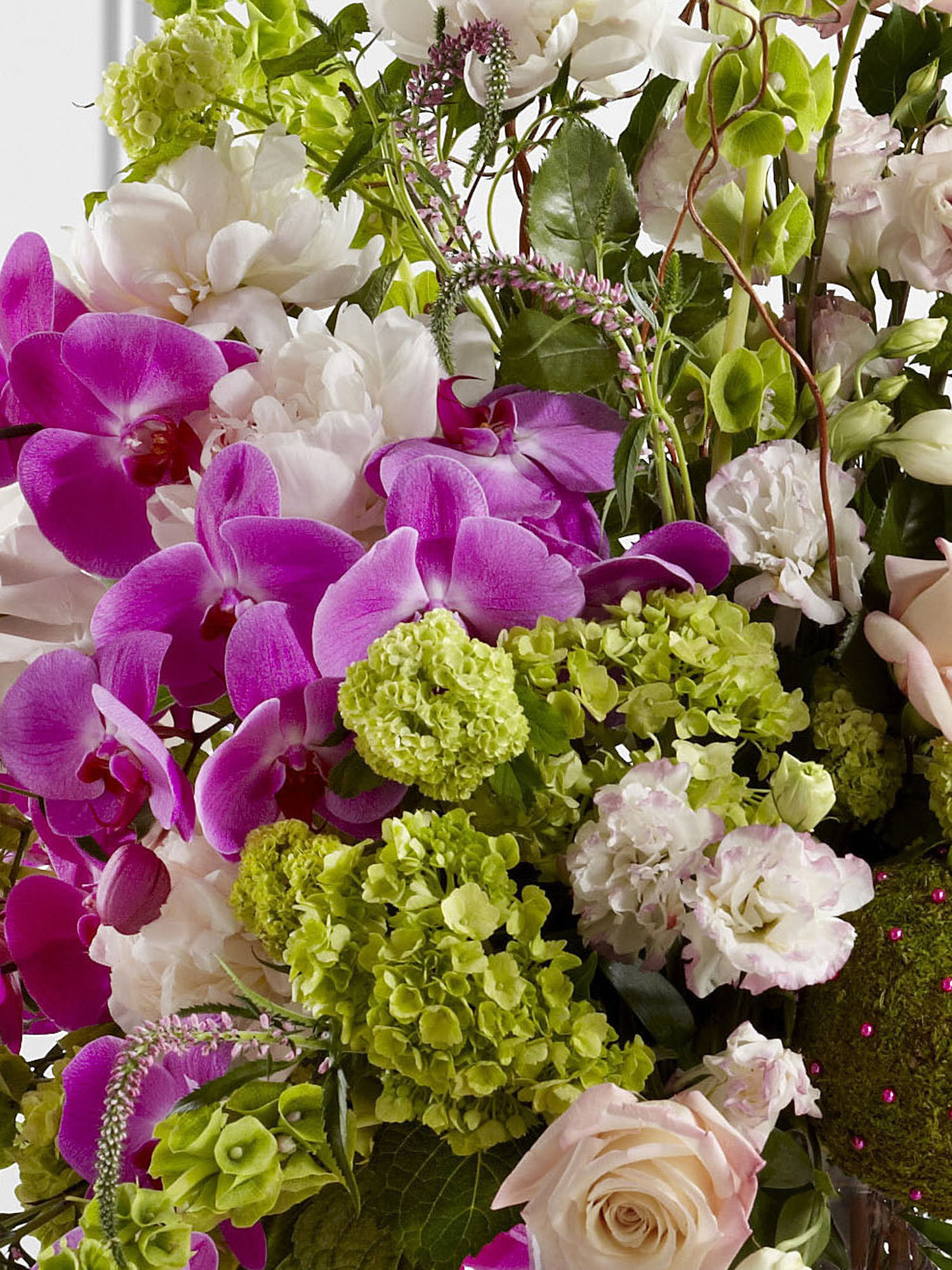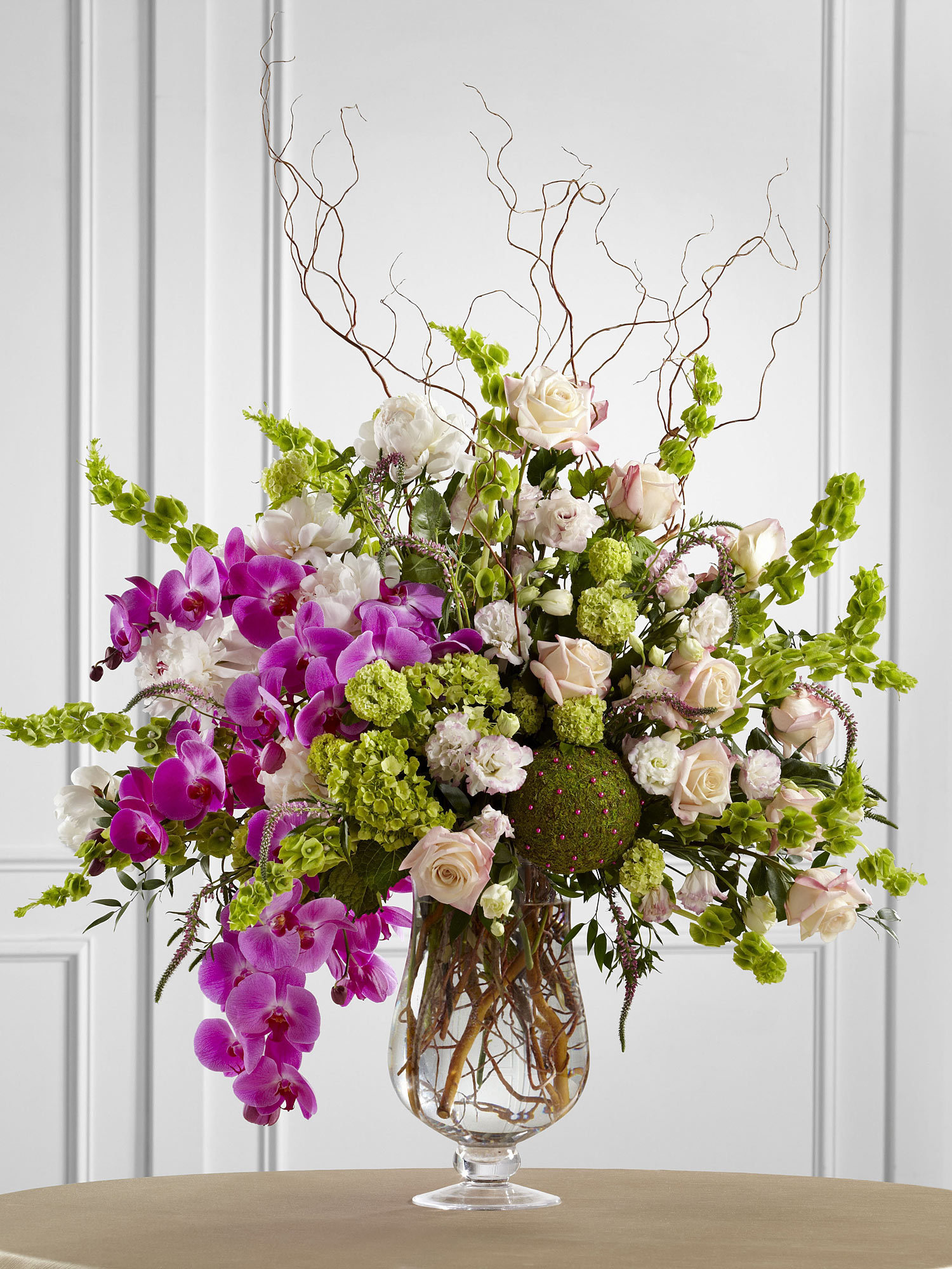 This fabulous vase arrangement is a presentation of cultivated taste and unmatched elegance. Pale pink roses, variegated pink double lisianthus, pink veronica, pale pink peonies, purple phalaenopsis orchids, mollucella, green hydrangea, viburnum stems and curly willow branches are carefully arranged in a 16-inch footed glass vase to create an amazing display of grace and beauty.