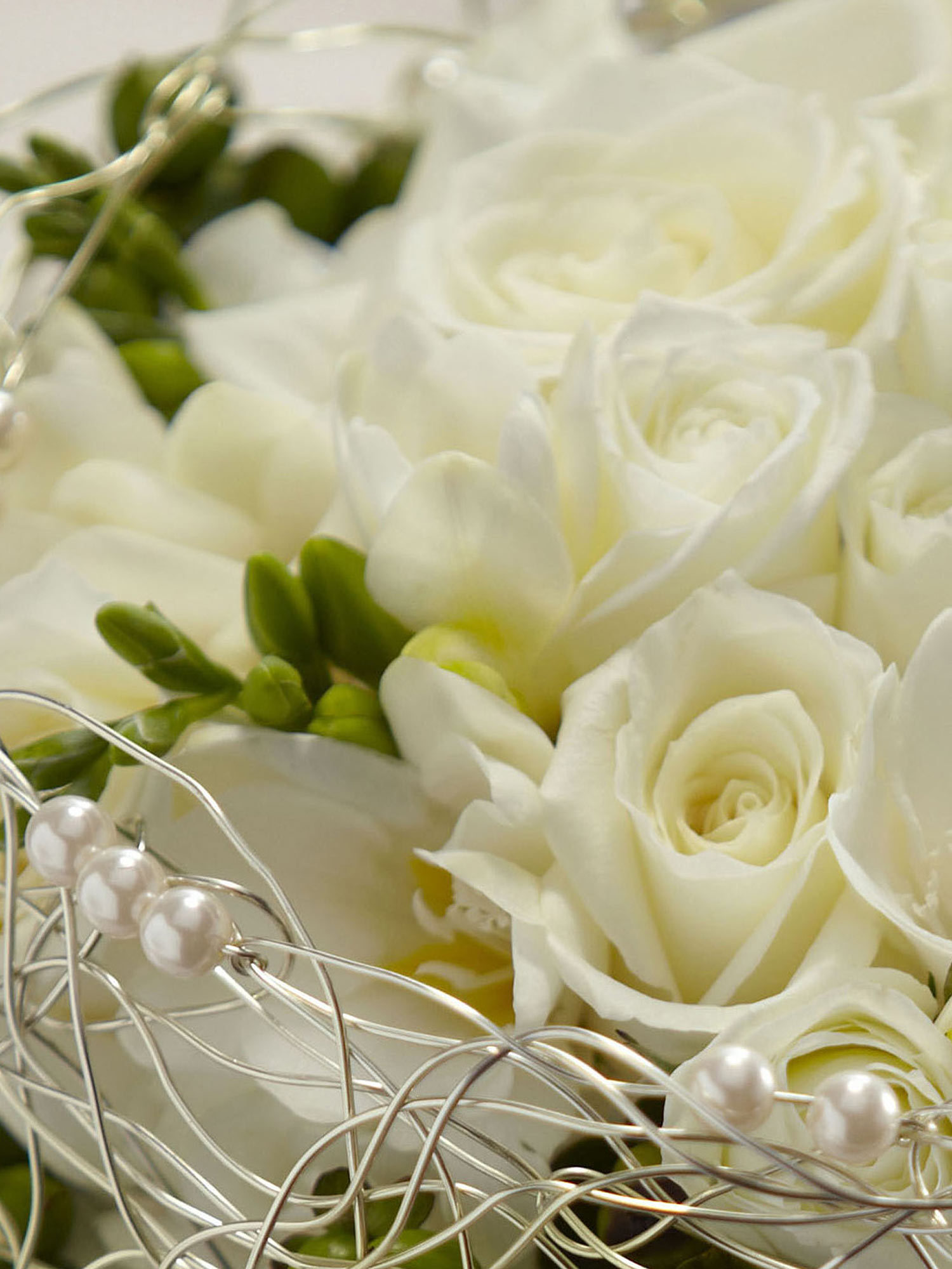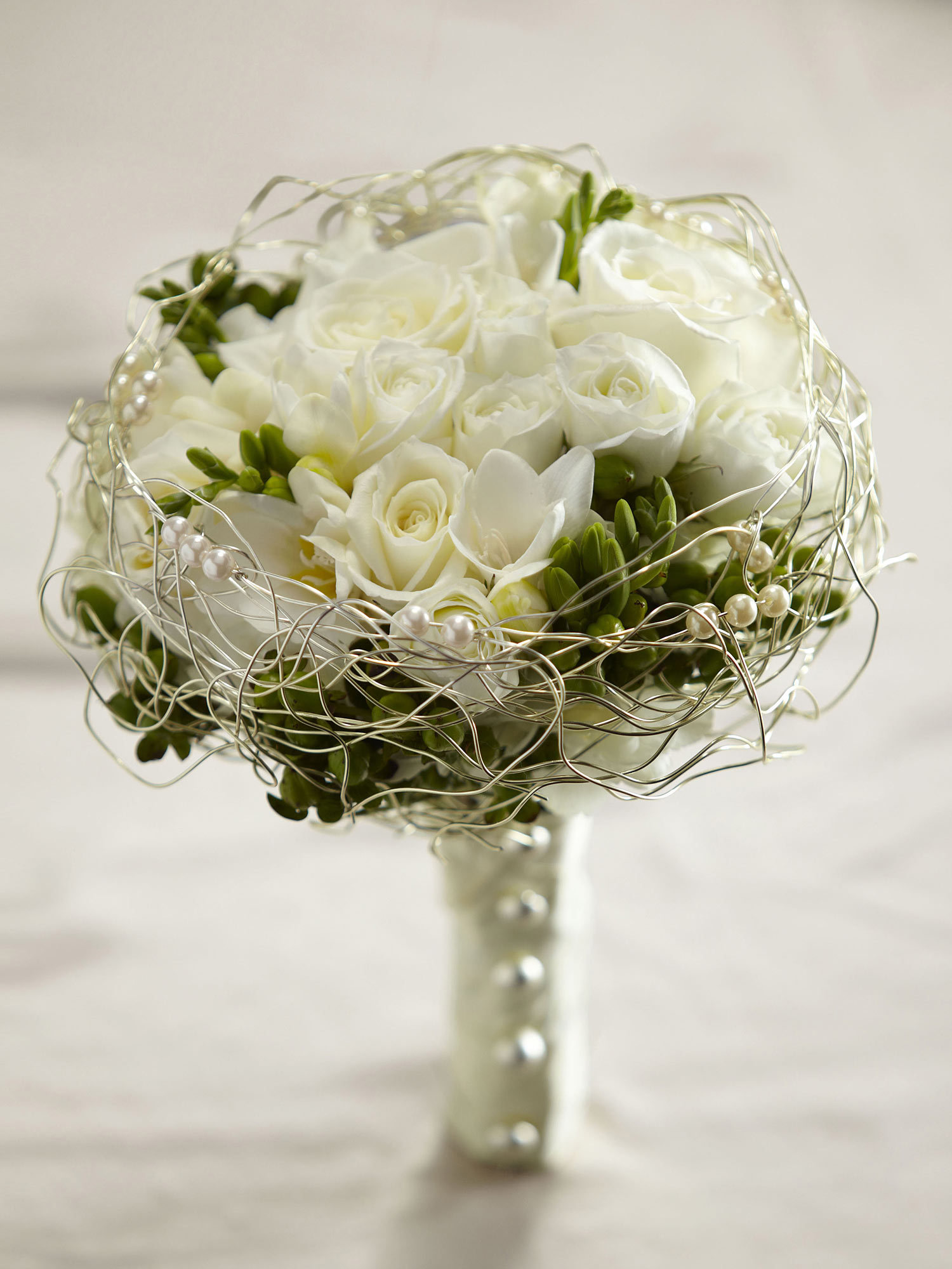 A romantic display of modern sophistication. White roses, spray roses, freesia, and hydrangea are accented with green hypericum berries and presented in an elegant gold wire bouquet collar displaying ivory pearls. With the stems wrapped in an ivory satin ribbon accented with domed silver buttons, this bouquet is the perfect accessory for your walk down the aisle.