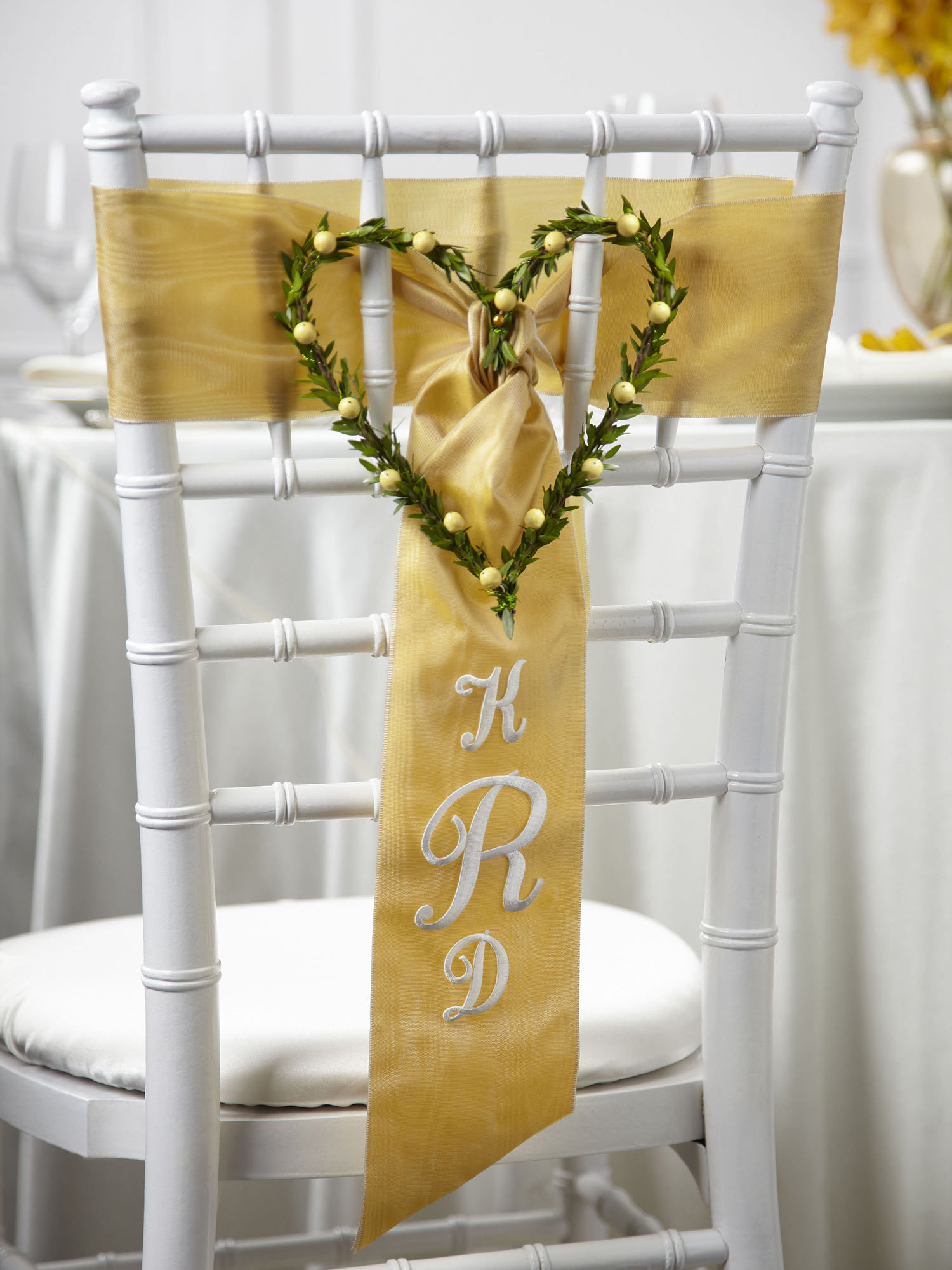 This unusual and truly beautiful chair decoration is an extra special touch to your wedding décor. Peach hypericum berries and mini myrtle stems form a perfect heart centered on a wide gold satin ribbon accented with the initials of the bride and groom.