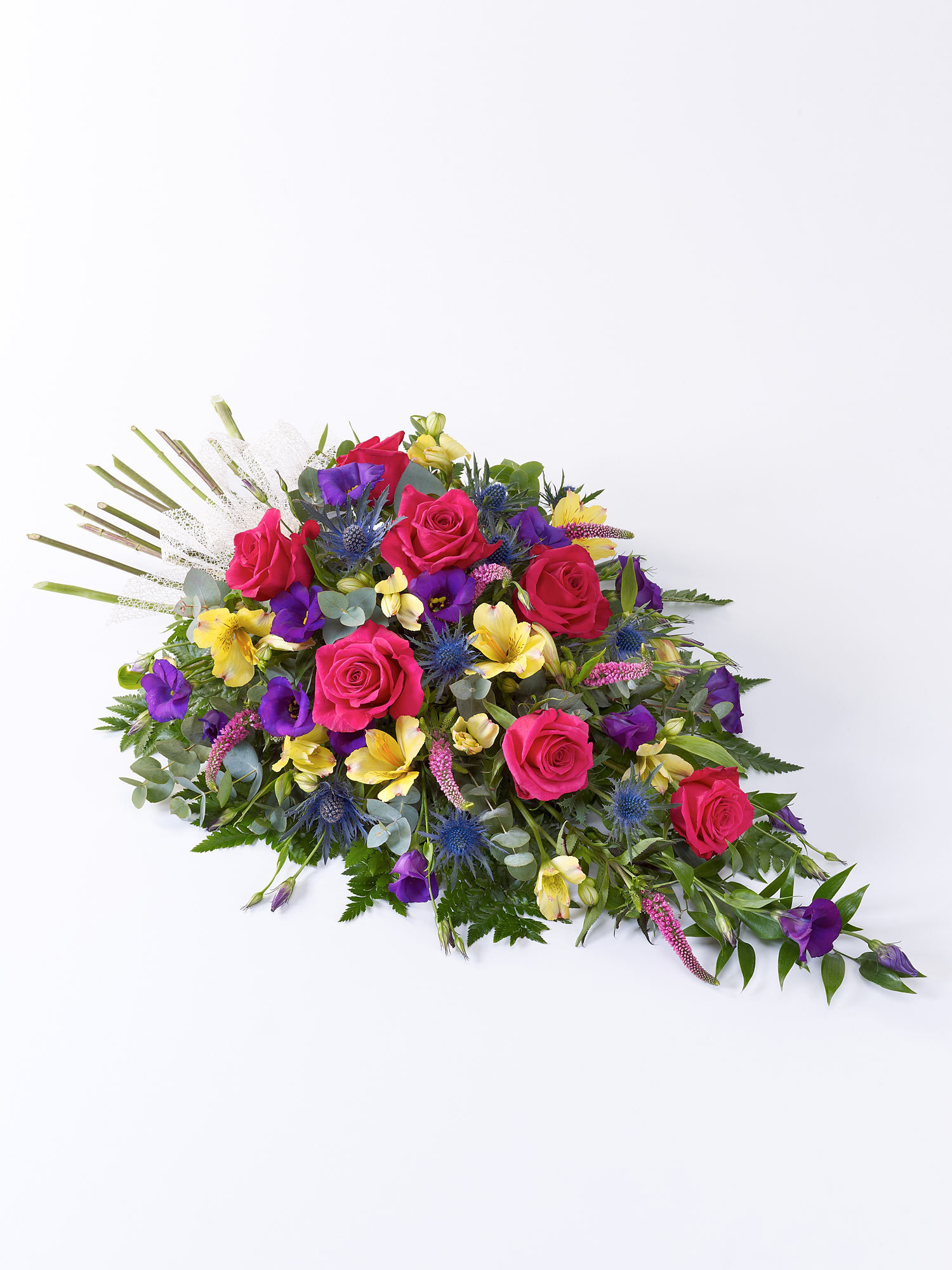 Large-headed roses, lisianthus, alstroemeria and veronica in pretty pinks, lilacs and creams are set off by blue eryngium, luxury foliages and a natural ribbon bow to create this woodland spray.